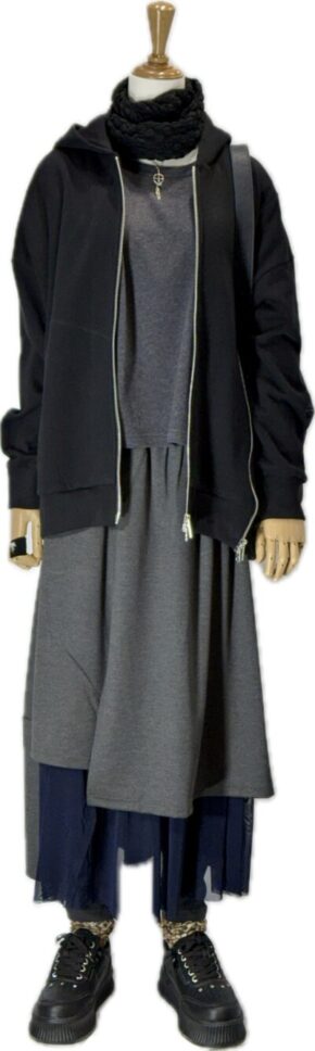 カジュアル モードライン モノトーンカラー Wジップ フードジャケット&半袖スエット& レギンスとロンスカのドッキングスカート 楽して個性的なコーディ シンプルなラインと思いきあ・・・ちょっとばかり違...