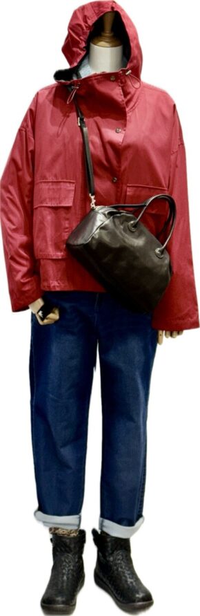 winter 最終 SALE. 50%~60% OFF 3シーズン仕様 ヤッケラインのフーディブルゾン&水色セーター&ソフトデニム で大人かわいいカジュアルコーディ レッド&ブラック ポリエ...