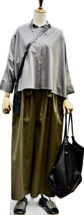 体型カバーにも役に立つデザインサロベットパンツ と ビックシルエットのシュートシャツジャケット バンドカラー前を止めてしまって ワイトパンツとショートブラウスのセットアップラインで 前を開けて カジュアルラインの綺...