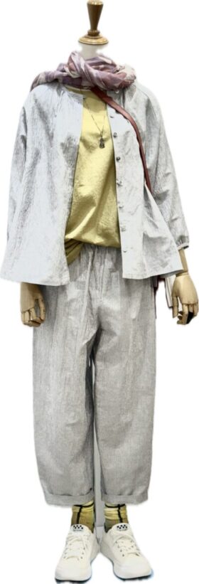 もう夏まで 先染めリネンワッシャー 横糸にリネンとコットンを配列した先染めの素材 清涼感と軽さが特徴で 縦シワ加工 プラウスはジャケットぽっく羽織っても 1枚着でも パンツとセットアップのワントーンで大人のお上品なカ...