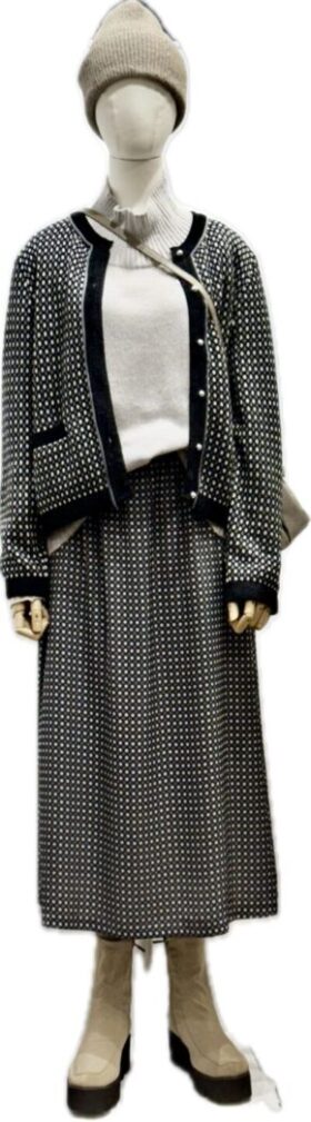 リアル&少し先を見据えた新しさ 「着慣れた中で」出会う 色から入る・・単純かつ最適 鳥居ユキ オリジナルドット柄のツイン・・・ ジャケットはニット仕様のシャネルライン スカート ポリエステル布 ブラック...