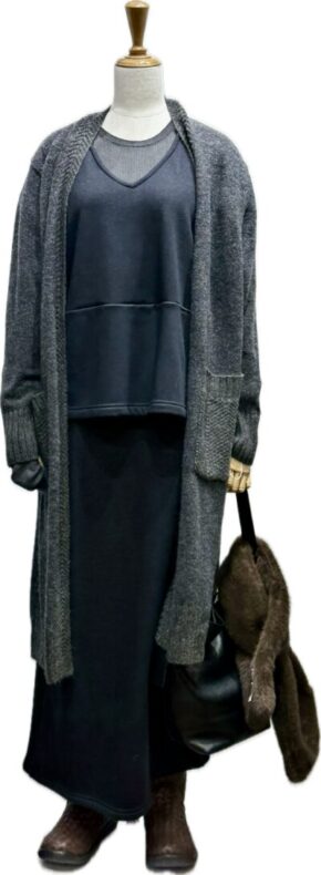 暖か重ね着コーディ インディゴブルーのニットのツインコーディ   シンプルなもの同士の重ね着で、オシャレに個性的に  丈の長さが少ない今 数は少ないですが 大人女子には必要です。 サイドライン インハイネックニットトネル...