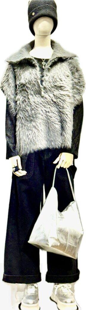 フェイクファーニットベスト& 爆暖仕様のワイドパンツ&ベロアチュニック 形と素材で息抜き 黒好きによる黒の上書きリスト使い勝手のいい フェイクファーニットベスト グレー 2ウエイライン 前ジップト...