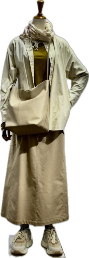 生成りのシャツのレイヤードでいつものカジュアルに 凛とした エッセンス カラーデニムのロングスカート 年齢とともに カジュアルな装いの さじ加減 も意識してクリーンなシャツ ベージュカラー 大人カジュアルを品良く サイ...