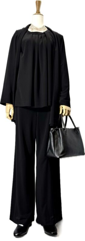 気 楽 フォーマル 体を締め付けない ニットの新感覚 のフォーマル 着やすい 極上のブラック ブラックフォーマルも時代が 変わりました。 柔らかい素材 ワイドパンツ ヘチマカラー長めのジャケット インチュニック...
