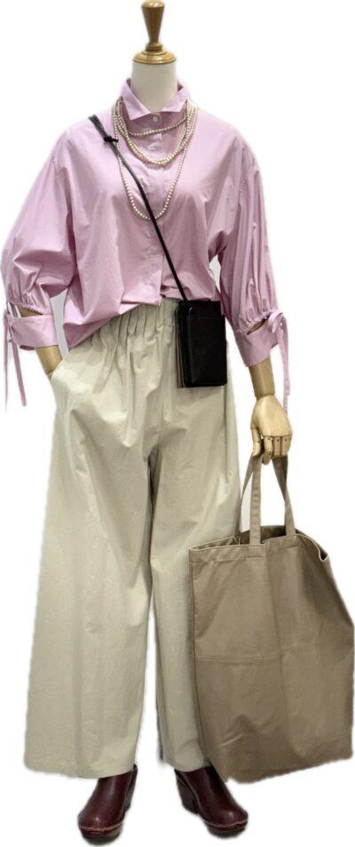 シャツラインのデザインブラウス 袖カフスとクシュっと提灯スリーブ