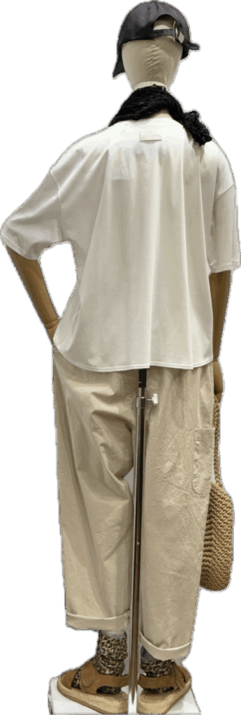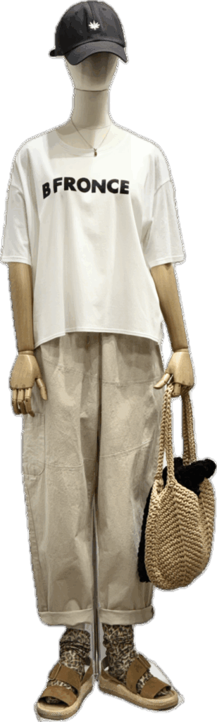 白のデザインロゴTと カラーデザイン テーパード のパンツ