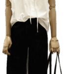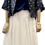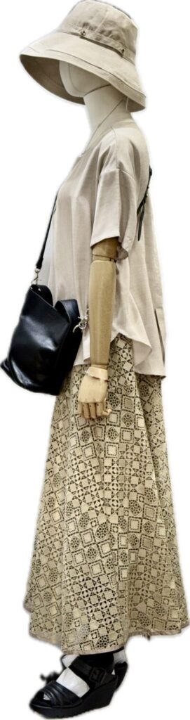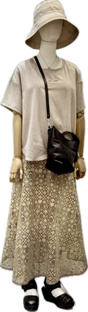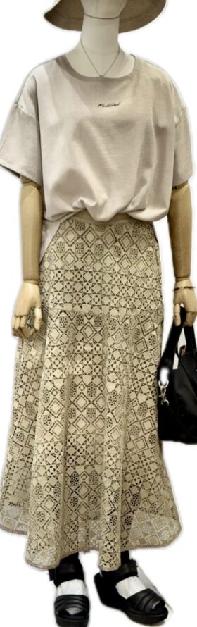 Tシャツ ラインのノーカラー ブラウス と レースのスカート
