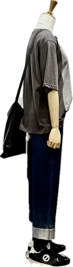 少し厚めのかっちりした素材のTシャツ 、体のラインを拾わずに