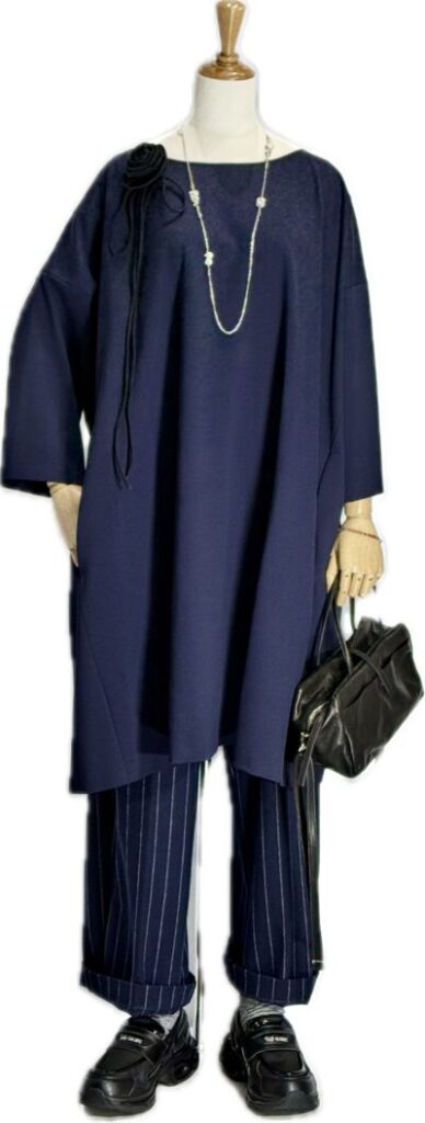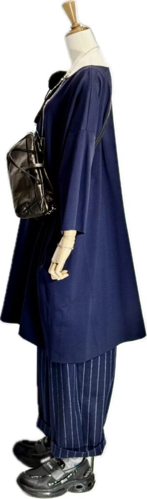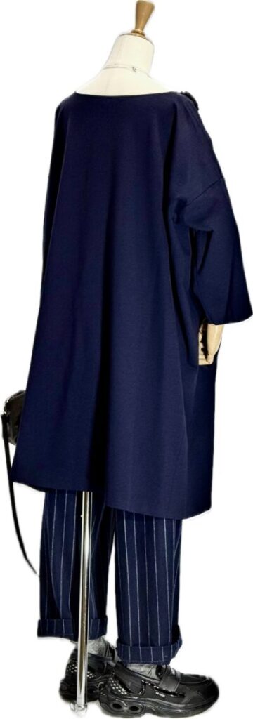 たっぷりと身幅のあるネイビーのニットソーのドレス