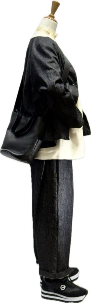 プラックデニム ラウンドカラーのジャケットとテーバードパンツ