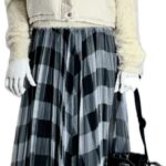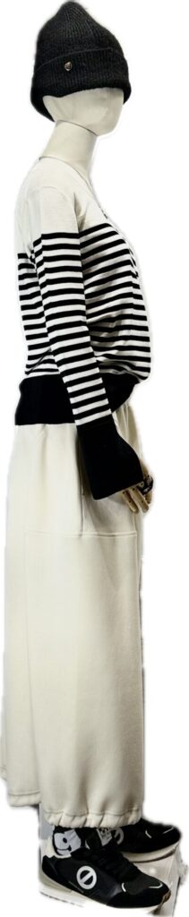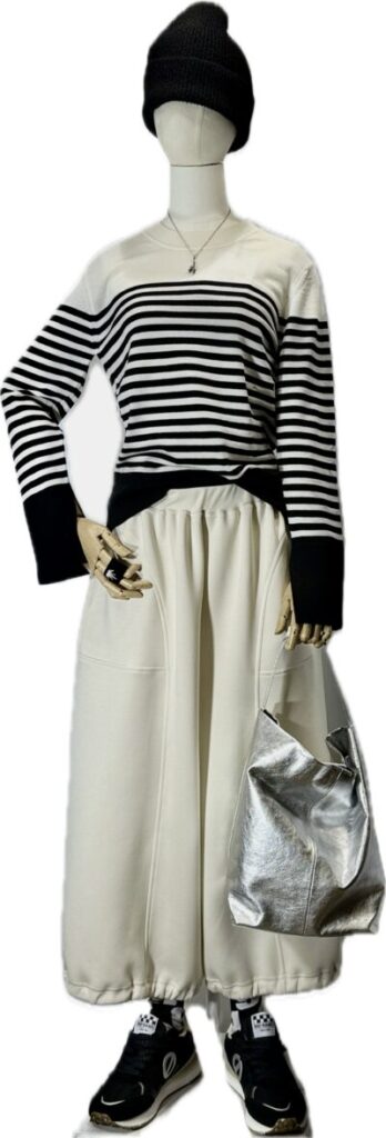 ボリュームのあるボトムをスッキリと見せるボーダーのニット