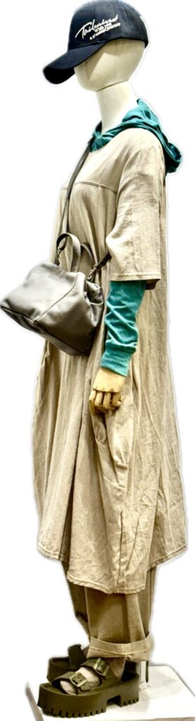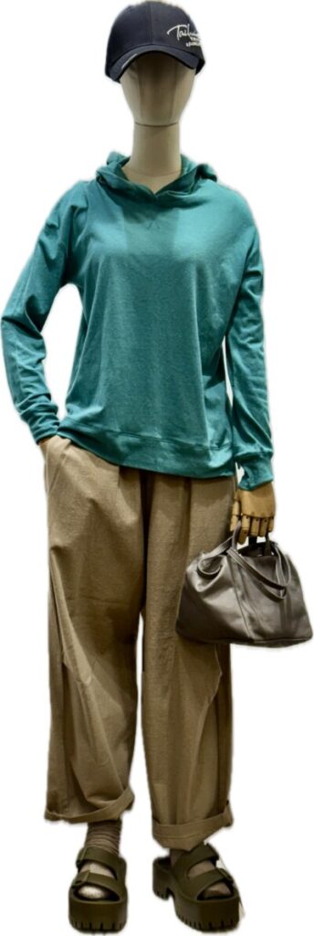 ベージュのワントーンにインにターコイズブルーのパーカーT スパイスして