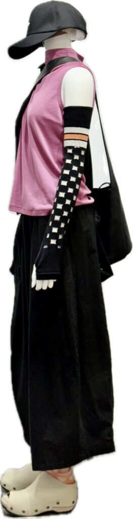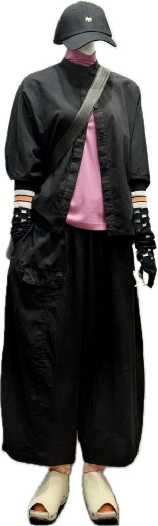 プラックのワントーンコーディ インに差し色 のピンクのボトルネック T