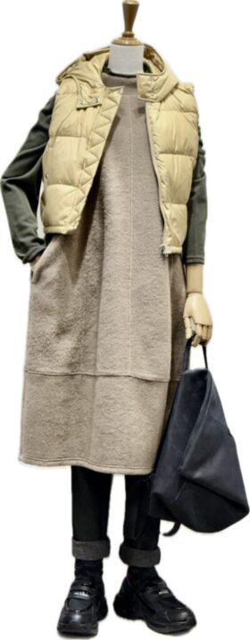 これからの暖かトップス ショートダウンベスト 定番ライン シンプルだけど・・・ショート丈  落ち着きのあるレモンイエローカラー サイドライン  インジャンドレ をジレ風に インのハイネックチュニック カーキ色 コクーン...