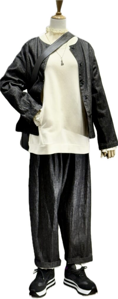外さないをいい事にとことんナチュラルなルーズライン プラックデニム ラウンドカラーのジャケットとテーバードパンツ 一度着てしまったらやめられない・・・  シルエットも締め付けない。過ごしやすい一方、手抜きにも見えない サ...