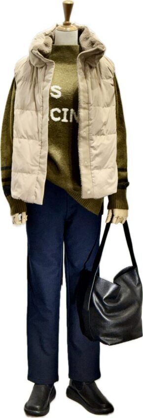 {ニットとダウンパンツで}スタイリングルーティン 何でもない、ベストとロゴ入りニット、パンツ ストレートラインのバンツ  安心感があり、抜け出せない組み合わせ、普通な綺麗めカジュアル 飽きないためのパターンがあるとさら...