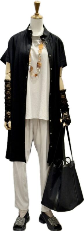 オールブラックの装いモダンカジュアル モードラインの重ね着 カットソーのフーディ&セラーカラーにもなるジャケット コットンストレッチカットソーベロア布のジャケット 誰とも被らない デザイン これからのパーティ ...