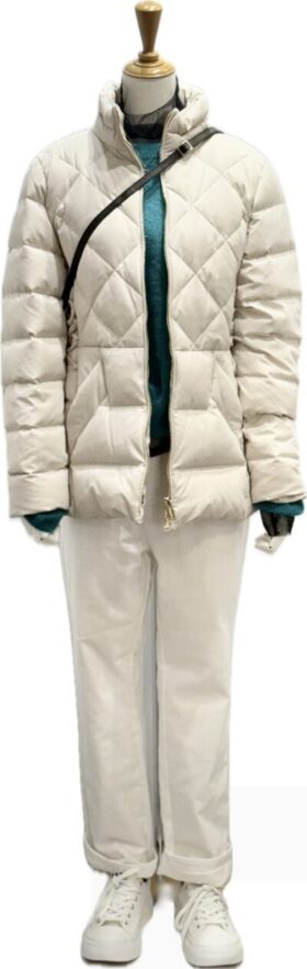 冬のデイリーシーンを特別に 優美なアイボリーとダイヤ柄の小粋なリズム  大人の余裕のダウンブルゾ ステッチのイレギュラーに  袖とウエスト下 ボーダーステッチ サイドのウエストにきゅっと出来る 紐使い  ステッチのイレ...