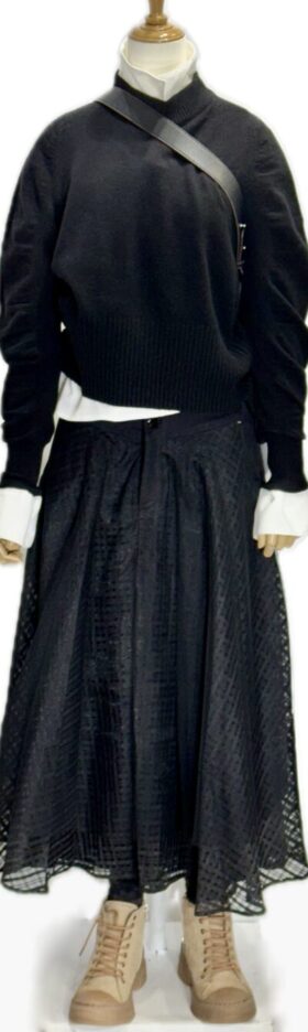 黒似合う黒 今を纏ったデザイン性 外さない安定感を味方に、デザイン性のある優れた カッコかわいいチュールのマキシースカート ショート丈のニット インにショートにシャツブラウス +++&G ganosch ニット ...