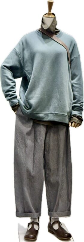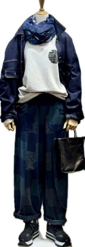色を深めてスエット ➕   デニム シーズンレスな組み合わせを今に調整するために  スエット自体を 秋冬色に更新 インにもカーキ色のハイネックT.  MARK AND PLUS +2 スエット  ダークサックス 素材 コ...