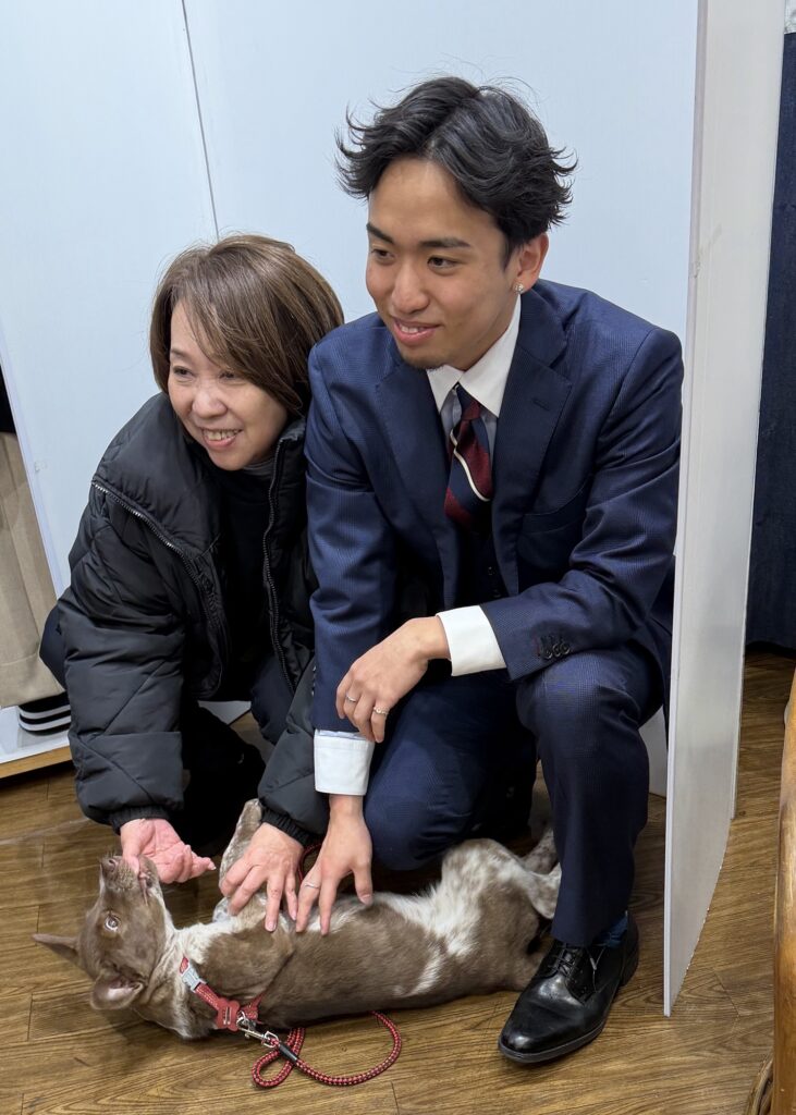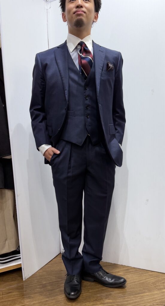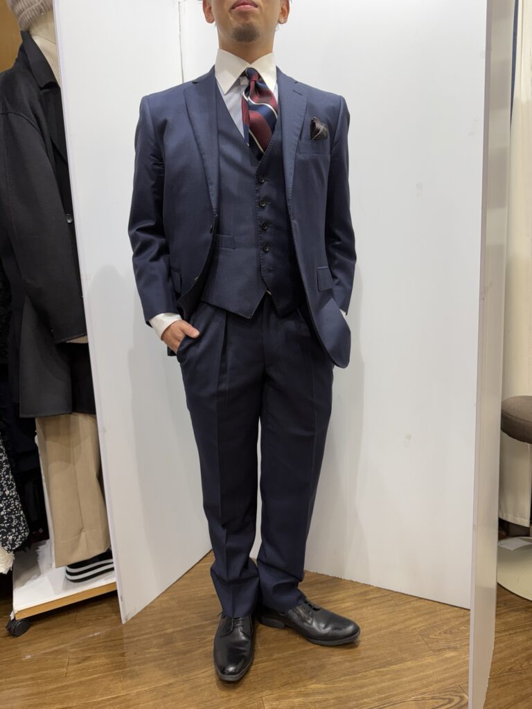 本日2026年1月11日は成人の日です。お花を贈らせていただいたお客様よりお礼に来店頂きました。小さい時からお母さんに付いてきていた子がもう成人となりました。スーツも入学式の時作って頂き成人式も兼ねています。紺のグレンチェックの3Pスーツにブルーのクレリックシャツにレジメンタイです。フレッシュ感満載のスーツスタイルです。2年前はお兄さんも成人されました。おめでとうございます!